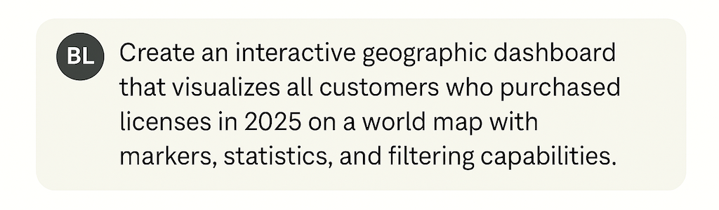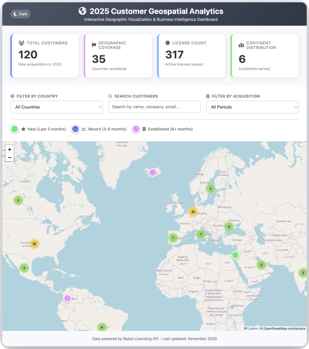 Connect Claude or any MCP-supporting AI directly to Babel Licensing Service to create powerful, data-driven applications through simple conversations. Build interactive geospatial dashboards, generate real-time business intelligence reports, and transform raw customer data into stunning visualizations—all in minutes. The advanced query interface supports natural language commands, complex multi-parameter searches with LINQ filtering, semantic data exploration, and instant access to customer orders, licenses, and revenue analytics, turning conversational requests into actionable business insights with automatic visual presentation.